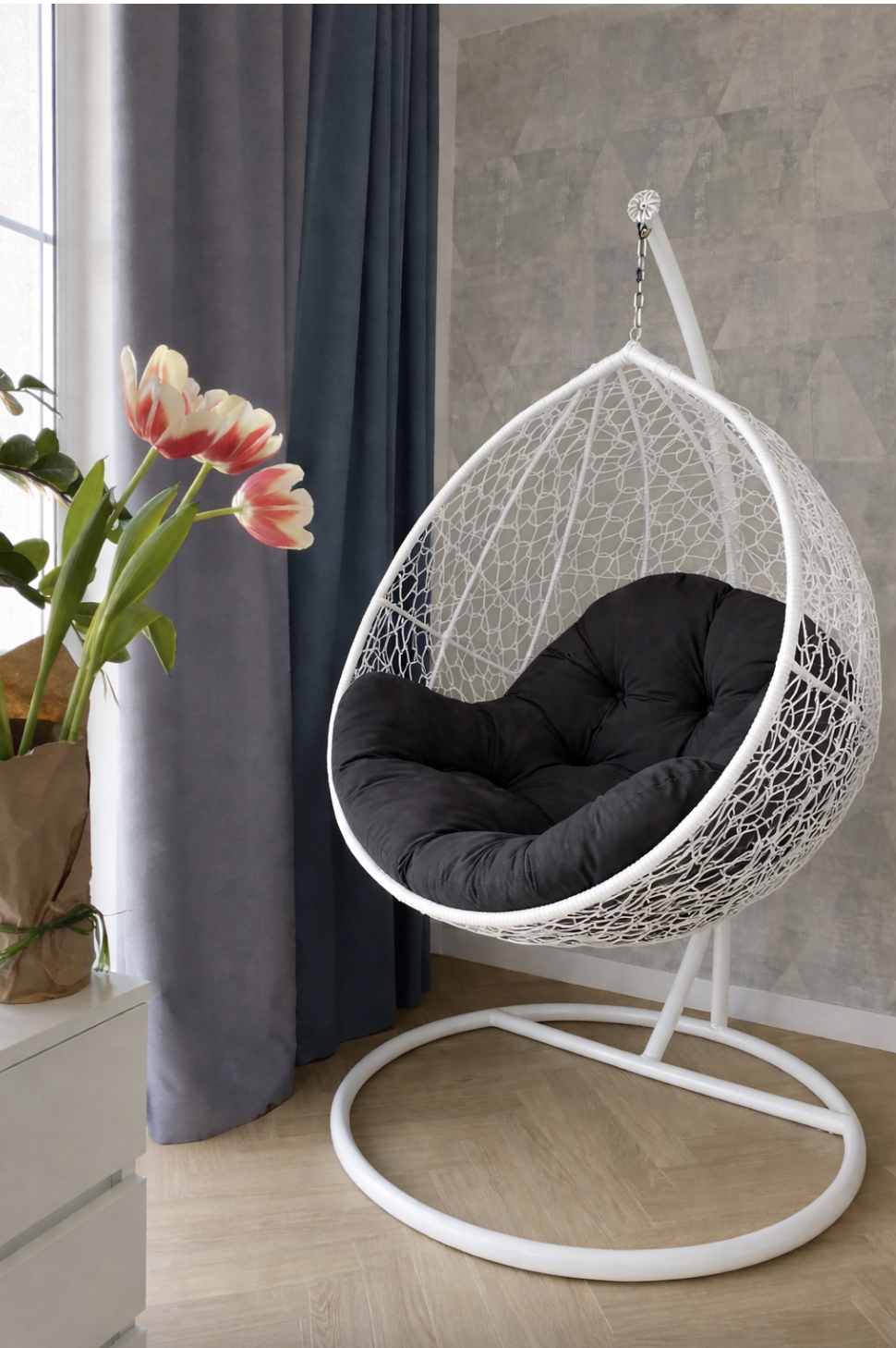 Підвісне крісло для квартири в стилі мінімалізм з ротанга зі стійкою. Міцний металевий каркас і стійка основа забезпечують надійність і безпеку. Щільне акуратне плетіння зберігає форму і розраховане на щоденне використання. Компактні розміри дозволяють розмістити крісло у вітальні, спальні або на лоджії без перевантаження простору. Глибока посадка і зручна спинка створюють комфортну зону відпочинку. Лаконічний дизайн без зайвих деталей легко вписується в сучасний інтер'єр.